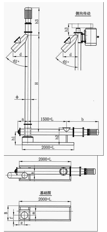 2、螺旋輸送機(jī)分水平槽機(jī)體(即喂料螺旋槽機(jī)體)和垂直機(jī)體兩部分。垂直機(jī)體分頭節(jié)、中間節(jié)、尾節(jié)三部分,每一部分又有集中不同規(guī)格的長度依機(jī)高選擇,可組成3~15m不同高度的整機(jī),螺旋機(jī)每增加0.5m為一高度規(guī)格,供用戶選擇。